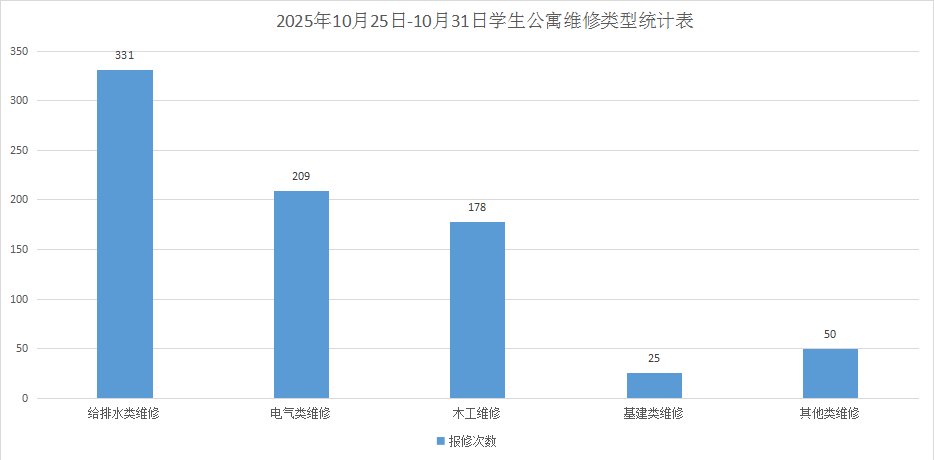 2025年10月25日-10月31日学生公寓共接单793单,其中给排水类331单、电气类209单、木工类178单、基建类25单、其他类50单,已完工775单,完工率97.73%,余18单在维修中。坚持对学生公寓84间配电房、 178个电表箱、2个水泵房日常巡检。