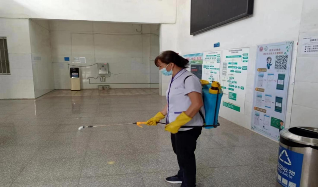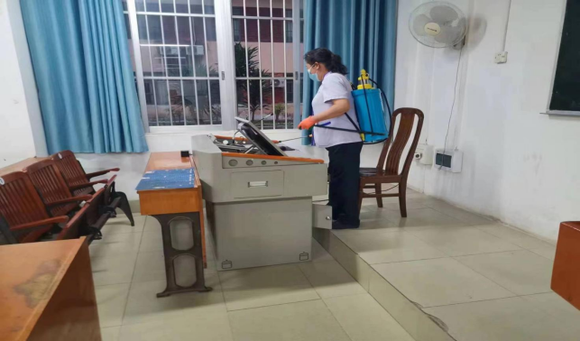 本周对公共教学楼宇的楼梯、走廊、门把手、课桌椅、电脑键盘、鼠标、水龙头、楼梯扶手、电梯间及按钮等高频接触表面进行重点杀菌消毒856次。