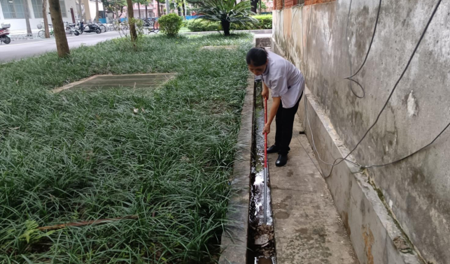 清理环境学院楼宇外围排水设施内淤泥和杂草