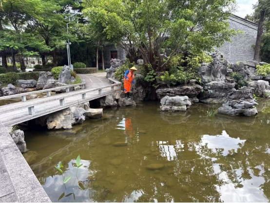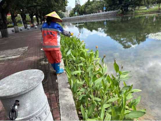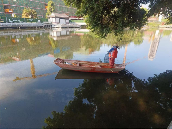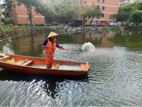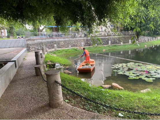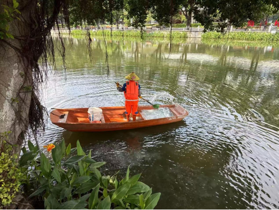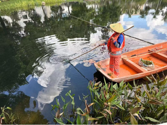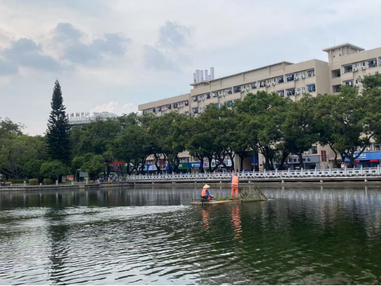 湖泊运维员每日进行湖面保洁、清理湖面油膜垃圾,保持水面干净整洁:对镜湖、鉴湖、翠湖、荷湖、莲湖、爱莲湖、彩蝶湖、大碧云湖、月牙湖、紫荆湖花带修剪;对镜湖、鉴湖、翠湖、春花湖、秋实湖、莲湖、荷湖、爱莲湖、彩蝶湖、大、小碧云湖、观月湖、绿榕湖进行打捞青苔;对秋实湖、西校园假山水池、汇学堂景观池、四教景观池打捞保洁,对观月湖、鉴湖、荷湖、莲湖、小碧云湖、大碧云湖荷叶修剪,对小碧云湖、镜湖、月牙湖和汇学堂景观池进行水质调理,春华湖青苔防控。