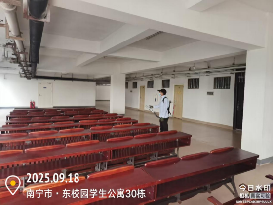 9月17日,我校出现一例输入性登革热病例,校园环境服务中心立即启动应急预案,在市、区疾控中心的指导下,由专业卫生消杀公司紧急在疫点核心区(100米)及外围200米范围内持续进行灭蚊消杀,每天上午8点至9点,17点至19点均进行灭蚊消杀,有效降低蚊虫密度。同时加强周边环境积水清理。