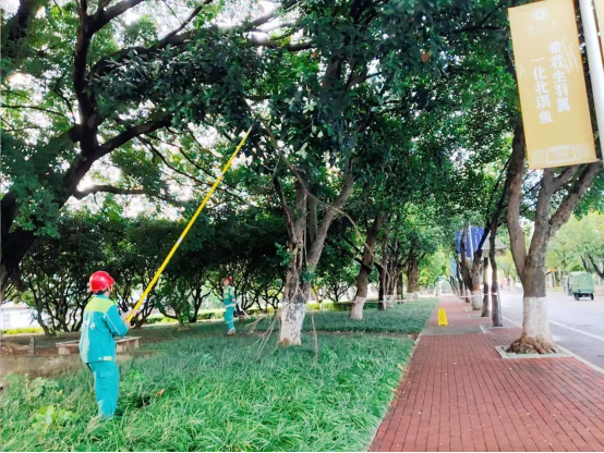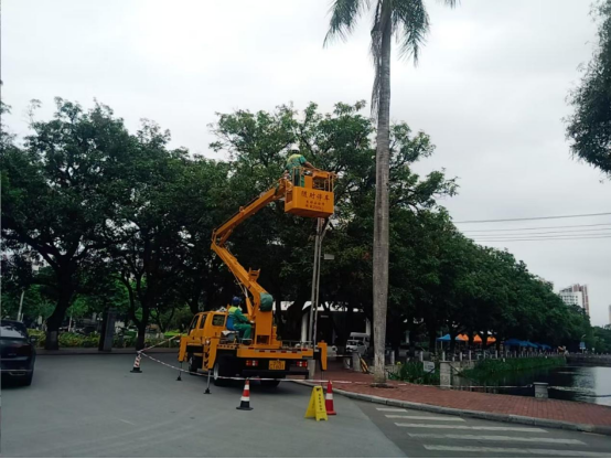 树木修剪:对化工学院、育才广场、南大门、体育馆、校办、汇学堂、西校园东区7栋、数信学院、中轴线、西体育馆、西体育场、荷湖、西校园北区26至36栋、东校园东区31栋、碧云湖、六教、后勤楼、 蝶山路、北校园学生公寓29栋、木工场路等区域进行枯枝处理、树木倒伏处理、雨后断枝处理,对低枝、侧枝、寄生树和靠近电线、建筑物、路灯及摄像头等设施的树枝进行修剪。