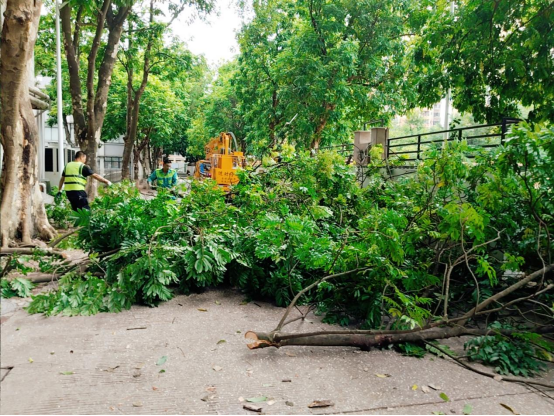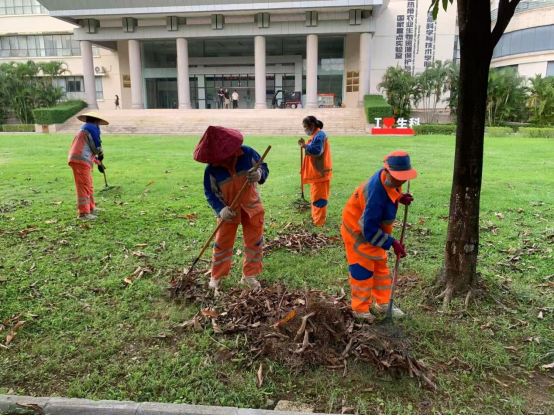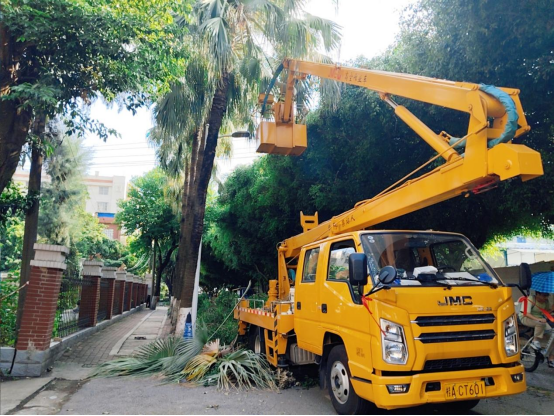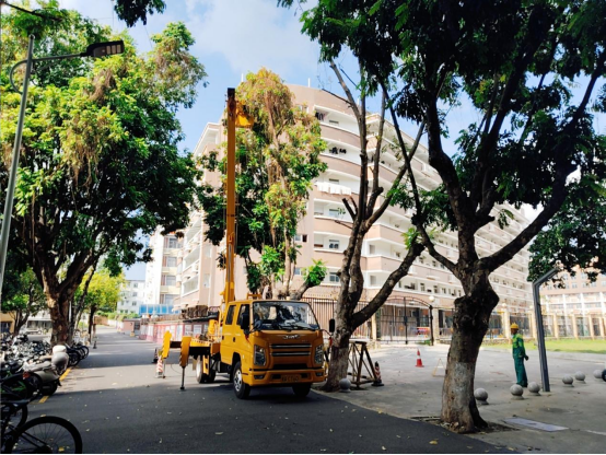 树木修剪:在资环材大楼、大礼堂、校办、莲湖、西体育馆、西校园西区13栋、国际生物实验室、东门、生科院、北校园教学楼、学生公寓35栋、艺术学院、六教、后勤楼、蝶山路、农场路、学生公寓27栋等区域进行枯枝处理、树木倒伏处理、雨后断枝处理,对低枝、侧枝、寄生树和靠近电线、建筑物、路灯及摄像头等设施的树枝进行修剪。