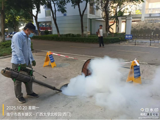 为保持良好的校园卫生环境,病媒生物防制板块于10月20日起至11月4日对东、西校园和北校区教学办公区、教职工住宅区、学生公寓区等外环境实施新一轮灭鼠杀虫,白蚁、红火蚁等病媒生物防制工作。防制范围包括所有的教学楼、办公楼、教职工住宅楼、食堂、农贸市场、医院、科研基地、仓库等外环境以及校园的主次干道的下水道口、公厕、垃圾桶(箱)、绿化带、雨水沟等,实际有害生物防制面积约136万㎡。其中绿地30多万㎡,下水道、化粪池及各类地井约3500个、小型污积水体约1万㎡,防制的主要内容包括对上述区域外环境的鼠、蚊、蝇、蟑螂等病媒生物及红火蚁、白蚁进行有效防制。