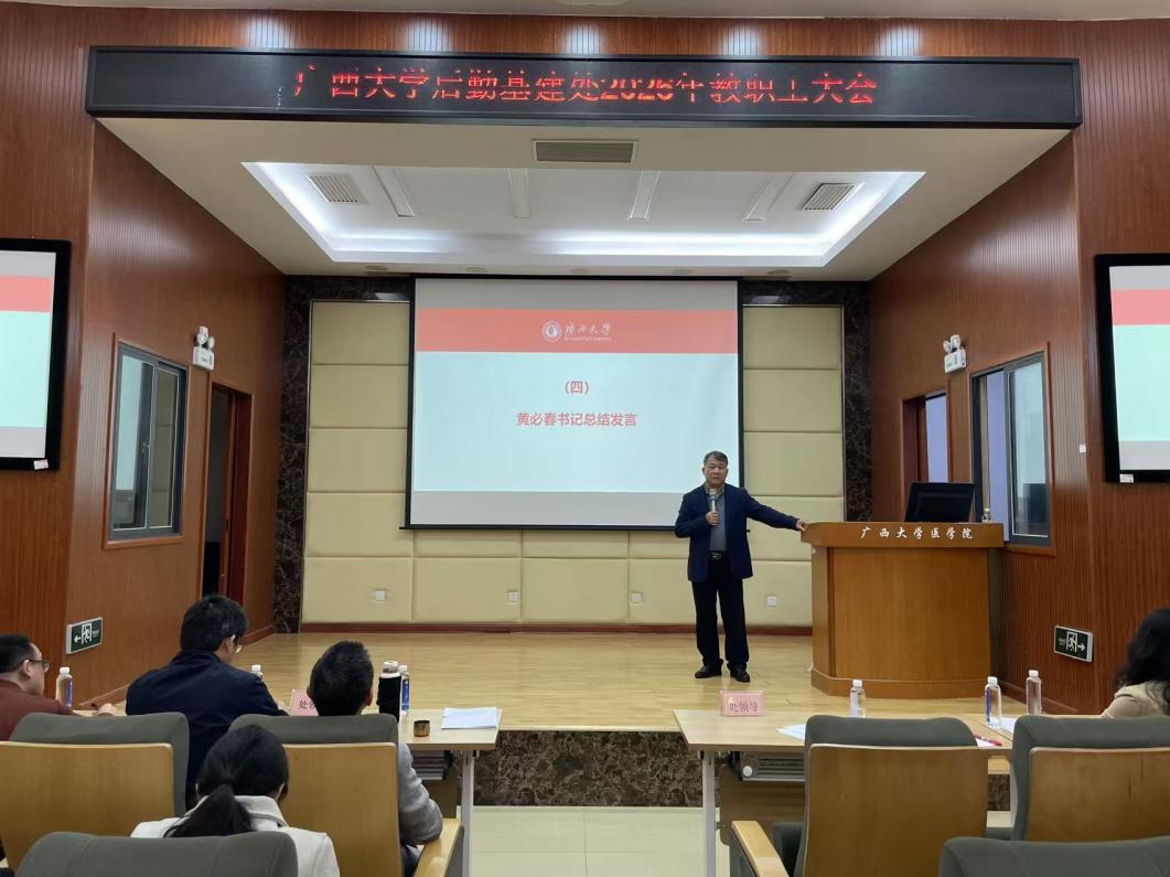 黄必春书记作总结讲话,他结合工作实际深入剖析后勤基建处存在的问题和努力方向,强调后勤基建工作事关学校发展全局,必须始终坚持服务学校中心工作,必须应势而为、乘势而上。针对2026年工作,他提出“四看”工作导向与“四干”实践要求:“四看”即看国家所谋,紧跟政策导向;看学校所需,紧扣发展大局;看师生所盼,聚焦急难愁盼怨;看后勤所为,靶向施策精准发力。“四干”即要有“时时放心不下”的责任感履职尽责,遵循“事事心中有底”的原则加快行动,按照“件件落实到位”的要求办好岗位业务,常怀“处处如履薄冰”的敬畏之心坚守安全生产和廉洁自律底线。